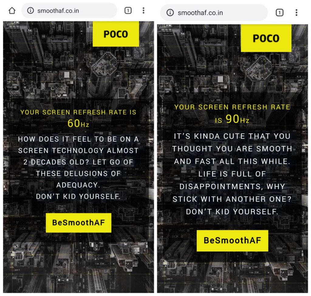 The company has also launched smoothaf.co.in website which shows the screen refresh rate of the phone you use. If it’s 60Hz it says that it’s almost 2 decades old and for phones with 90Hz refresh rate it says that “You thought you are smooth and fast all this while”, so the POCO X2 should have a 120Hz refresh rate.