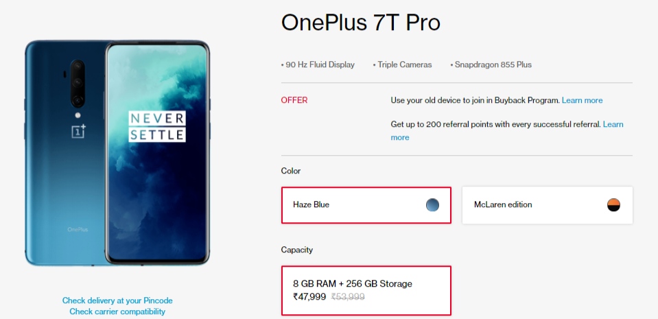 OnePlus hasn’t slashed the prices of the OnePlus 7T Pro McLaren Edition as it is still listed at Rs. 58,999. The OnePlus 7T is also listed at Rs. 34,999 that has been the case for a while now.