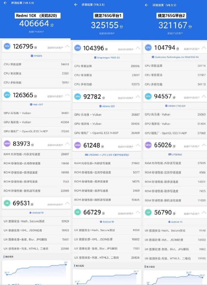 A screenshot of comparing AnTuTu benchmark scores of Dimensity 820 SoC which powers the Redmi 10X/10X Pro 5G phones and Snapdragon 765G SoC has surfaced online which shows the former scoring 406,664 points while the later managed to score 325,155 points.