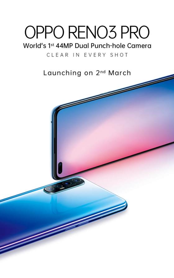 Oppo Reno 3 Pro is listed to sport a dual selfie camera setup in a hole-punch display, with a 44-megapixel primary sensor and a 2-megapixel secondary.